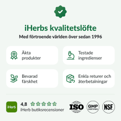 iHerb strävar efter att säkerställa att produktbilder och information är korrekta, men vissa förändringar i förpackning och/eller ingredienser kan vänta på att uppdateras på vår webbplats. Produkter kan därför ibland levereras i en alternativ förpackning, men vi garanterar alltid färskhet. Vi rekommenderar att du läser etiketter, varningar och anvisningar på alla produkter innan användning och inte enbart förlitar dig på informationen som tillhandahålls av iHerb. Den här webbplatsen har maskinöversatts som en service till våra kunder. iHerb lämnar inga garantier för att översättningarna är fullständiga eller felfria och ansvarar inte för eventuella översättningsfel eller utelämnanden.